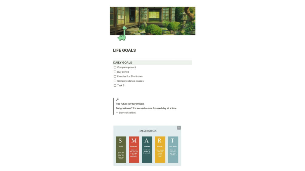 - πΏ Aesthetic Visuals & LayoutInspired by serene garden scenes and Studio Ghibli vibes, the design fosters calmness, joy, and a sense of mindfulness while planning your goals.